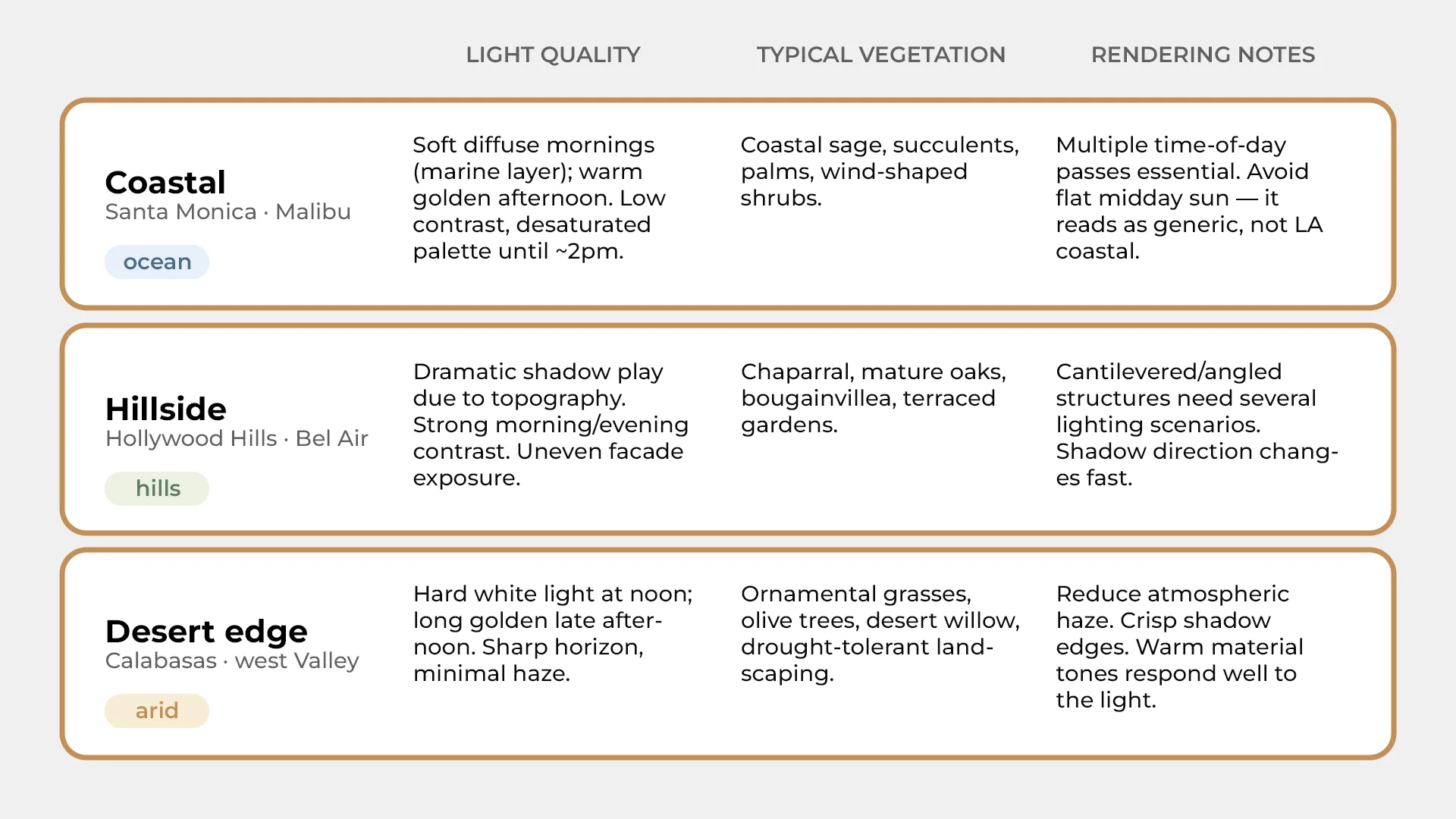 The coast — Santa Monica, Malibu — runs under the marine layer for most of the morning. Diffuse light, compressed shadows, colors that read flatter than you’d expect until the afternoon comes in. Vegetation stays low: coastal sage, succulents, the occasional palm bent from years of sea wind. Studios delivering realistic exterior renderings for coastal properties know this rhythm. The ones that don’t tend to light everything at noon and wonder why the client pushes back.
